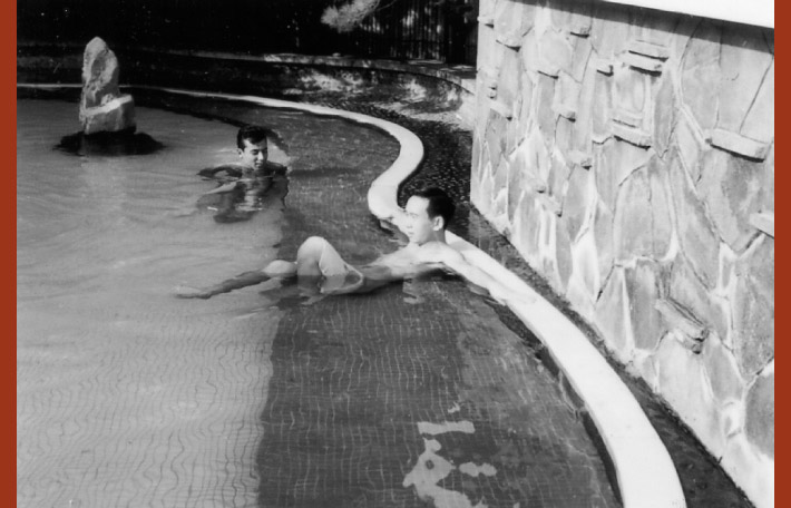 ちなみに次の写真はお客様から提供していただいたものですが、この本館の屋上に完成した露天風呂です。ものすごく広い、なにしろ男女ぶち抜きの混浴だったのです。