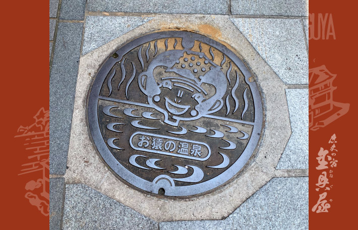 前節で触れたように、地勢上渋温泉はバス団体旅行には不向きでしたが、何もしなかったわけではなく、渋温泉に点在していた地域住民の共同浴場を宿泊のお客様に開放する企画「苦労を流す九つの外湯巡り」、それに付随し手拭に朱印を集める「巡浴手拭」を販売、北信に縁の深い葛飾北斎の川柳句碑の設置、地獄谷野猿公苑とセットにしたキャッチフレーズ「お猿の温泉渋温泉」と猿のキャラクター。現在の渋温泉の核となるこれらの企画はすべて昭和40年代に開発されたものでした。(※画像は今の渋温泉のマンホール。この初期デザインは昭和40年代に行われました)