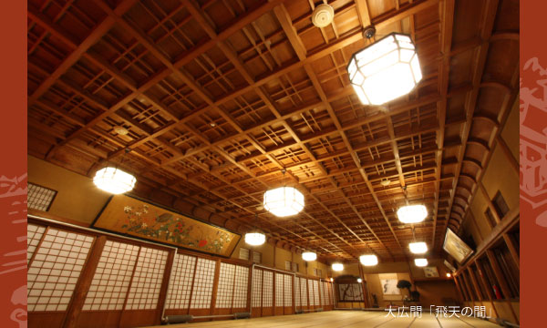 大広間 | 最上階にある本間130畳の木造大宴会場。舞台は昭和11年に完成をした当時のまま。座敷は戦時中に大雪で倒壊し、昭和25年に再建。その際に天井を非常に独特な2重の格天井に変更。今もその姿を残しています。現在は宿泊の方の食事処として使用。 |