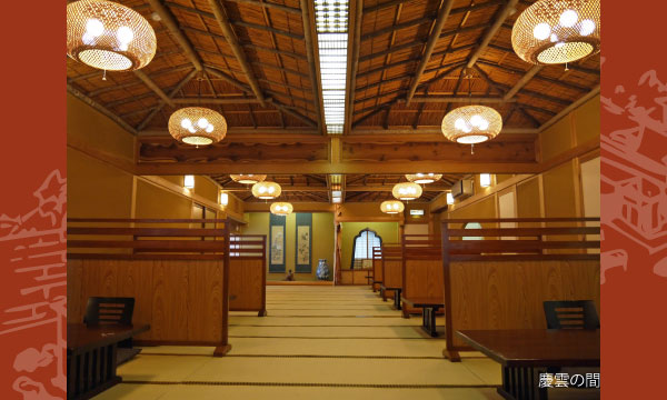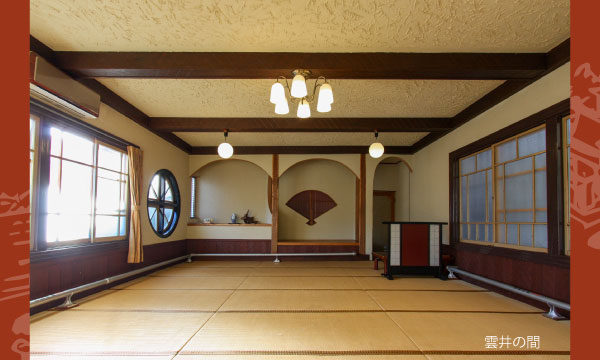 雲井の間 | 大広間の下階にある24畳の木造の会場。昭和25年の広間再建時に、ダンスホールとして作られた。天井や窓枠にその姿が残っています。現在は宿泊の方の食事処として使用。 |