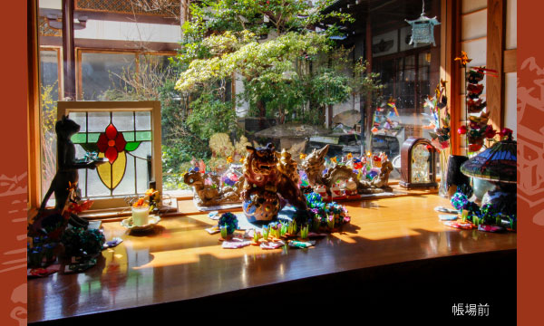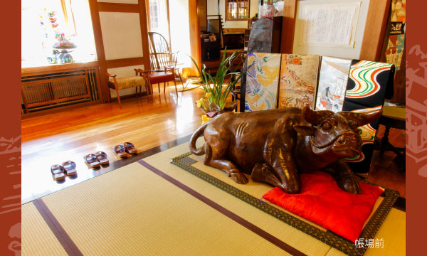 帳場 | 玄関すぐのところにある受付。金具屋には売店はありませんが、受付脇に小さなグッズ販売スペースがあり、金具屋オリジナル品、しぶざるくん、温泉むすめなどのグッズを販売しています。宅急便の発送もうけたまわります。 |